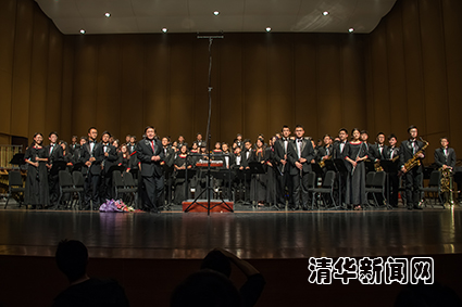 军乐队同学在返场演出中,加演了流行曲目《愤怒的小鸟》和《小苹果》,将整场演出推向高潮,迎来了观众的热烈掌声。音乐会最后,清华大学军乐队指导老师朱汉城教授指挥军乐队演奏老校歌,全场师生纷纷起立、齐声高唱,本场新年音乐会也在老校歌的歌声中缓缓落下了帷幕。