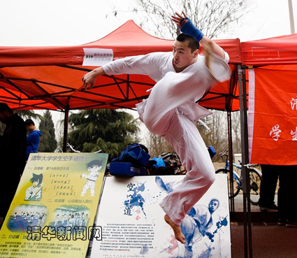 图为跆拳道社凌空飞踢引来一阵赞叹。王建一