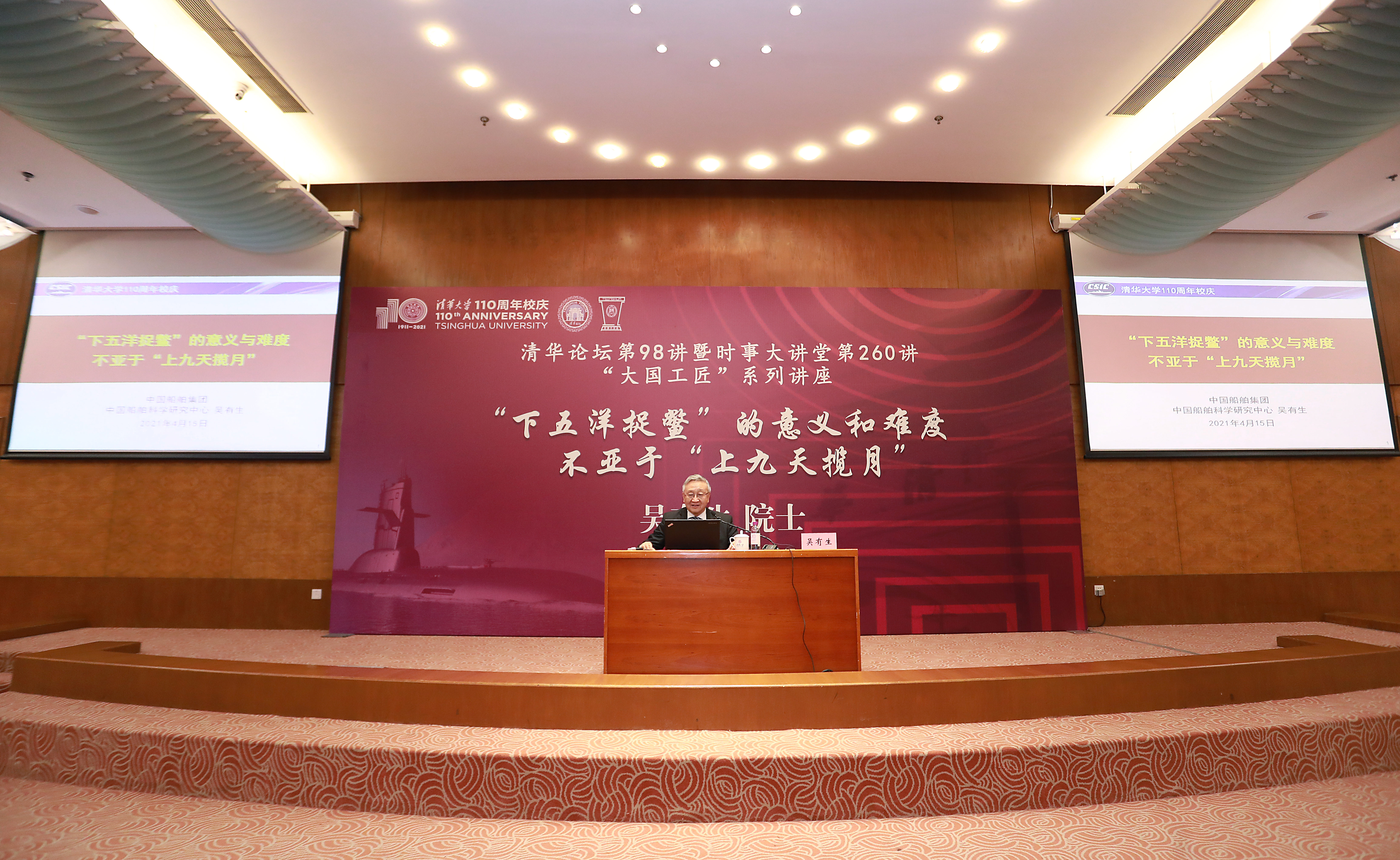 清华新闻网4月18日电(通讯员 周子靖 姜振煜 摄影 许德刚)4月15日下午,清华大学校友、中国工程院院士、中国船舶集团第七〇二研究所名誉所长吴有生做客“清华论坛”第98讲暨“时事大讲堂”第260讲,作题为“‘下五洋捉鳖’的意义和难度不亚于‘上九天揽月’”的主题报告。科研院院长方红卫主持论坛。