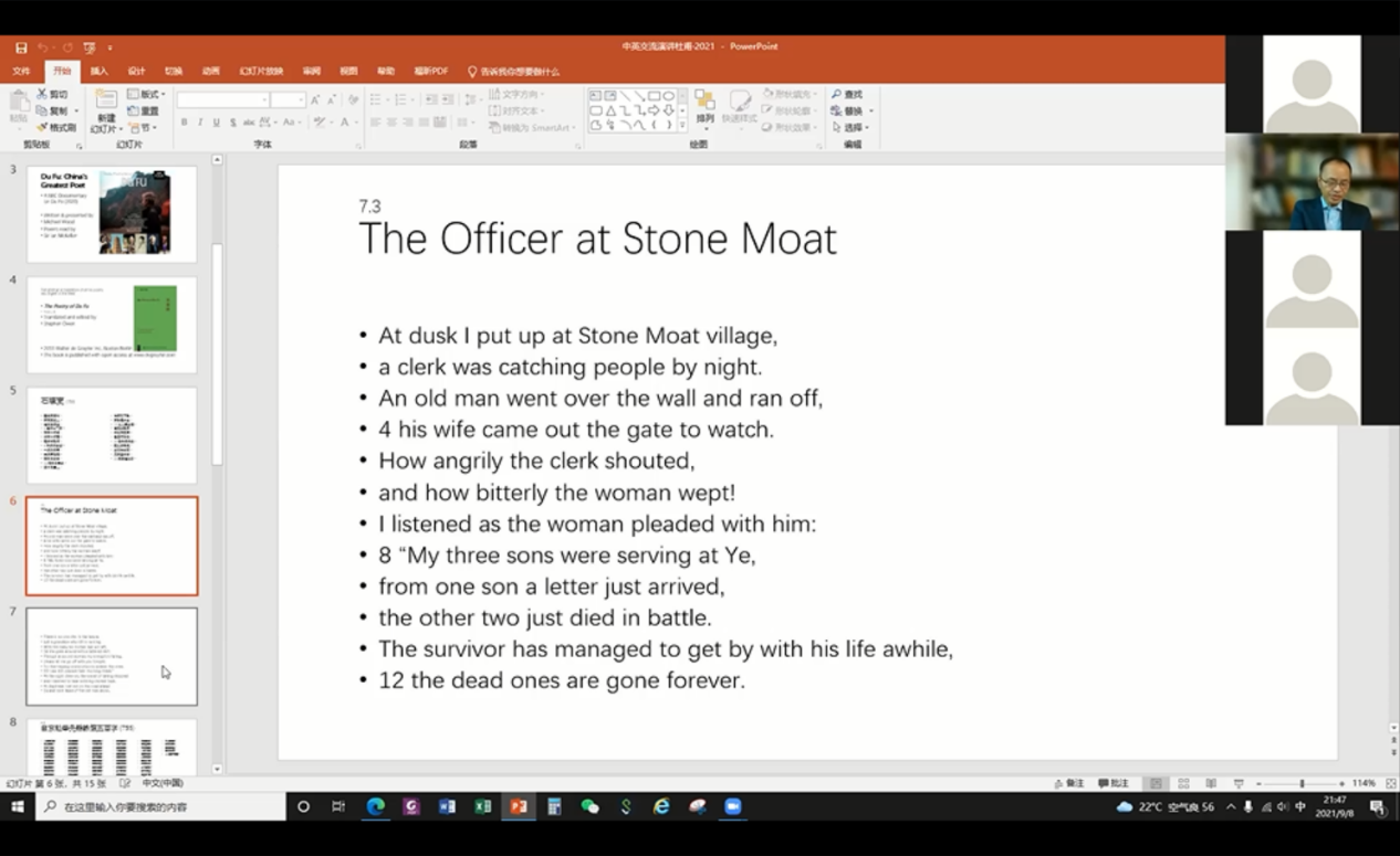 晚21:00,清华大学外国语言文学系教授余石屹以“杜甫对底层人民的同情:一个发展的视角”(An Evolutionary Perspective on Du Fu as a Great Poet of Sympathy for the Down-trodden)为题,分享了BBC纪录片《杜甫:中国最伟大的诗人》以及哈佛大学汉学家宇文所安(Stephen Owen)的杜甫诗作译本。以《石壕吏》和《自京赴奉先縣詠懷五百字》为例,通过翻译带领青年学生们感受不同的诗学传统及其不同的文化和价值在文学中所留下的痕迹。