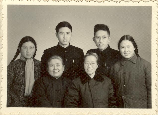 母亲张一贯、姨妈张一飞和钱易兄妹四人(6人均为教师,第一排左起:张一贯、张一飞;第二排左起:钱易、大哥钱拙、二哥钱行、妹妹钱辉)