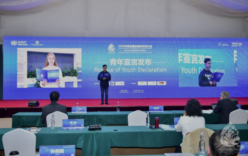 论坛尤为强调青年在发挥气候变化与生物多样性协同作用的中坚力量。清华大学水利系博士生陈星安和麻省理工学院本科生、清华大学苏世民学者艾娃·薇茨(Awa Wailtz)作为中美两国学生代表以现场连线的方式共同发布《碳中和目标下应对气候变化与保护生物多样性青年宣言》。此外,论坛现场还展示了全国青少年为本次大会绘制的“迈向碳中和·孩子眼中的世界”系列绘画作品,以凸显青年行动的代际传承。