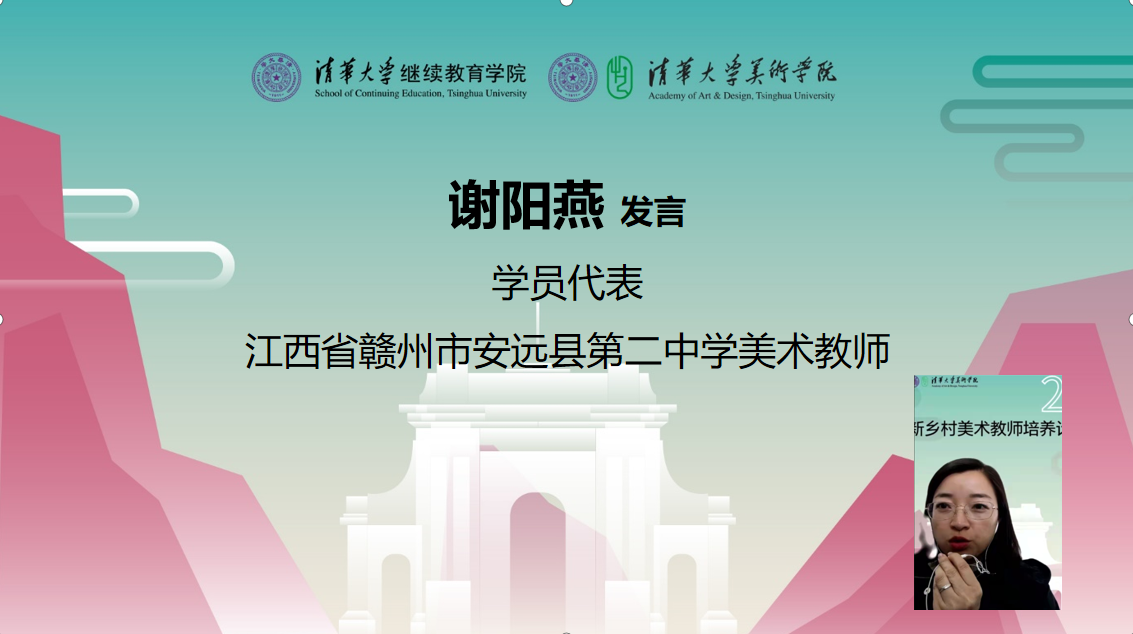 江西安远县第二中学美术教师谢阳燕代表学员向清华大学表示衷心的感谢。她表示,作为一名偏远小县城的普通美术教师,深感自己综合素质、美术教学技能等方面有很多欠缺,又苦于经费、时间、信息闭塞落后等因素无处进修提高。她非常珍惜此次学习机会并期待与大家共同学习进步。