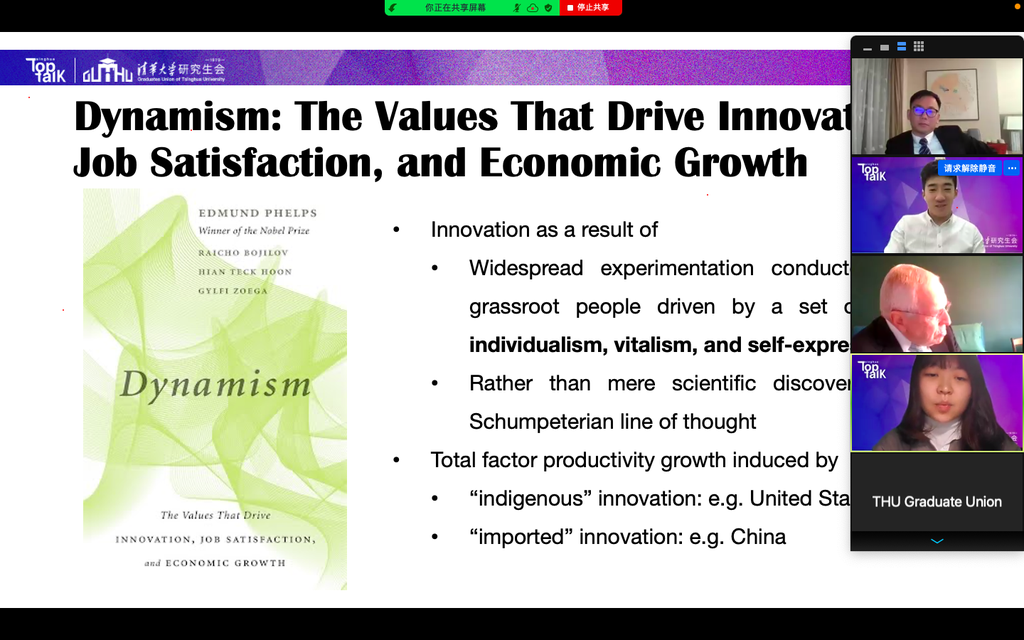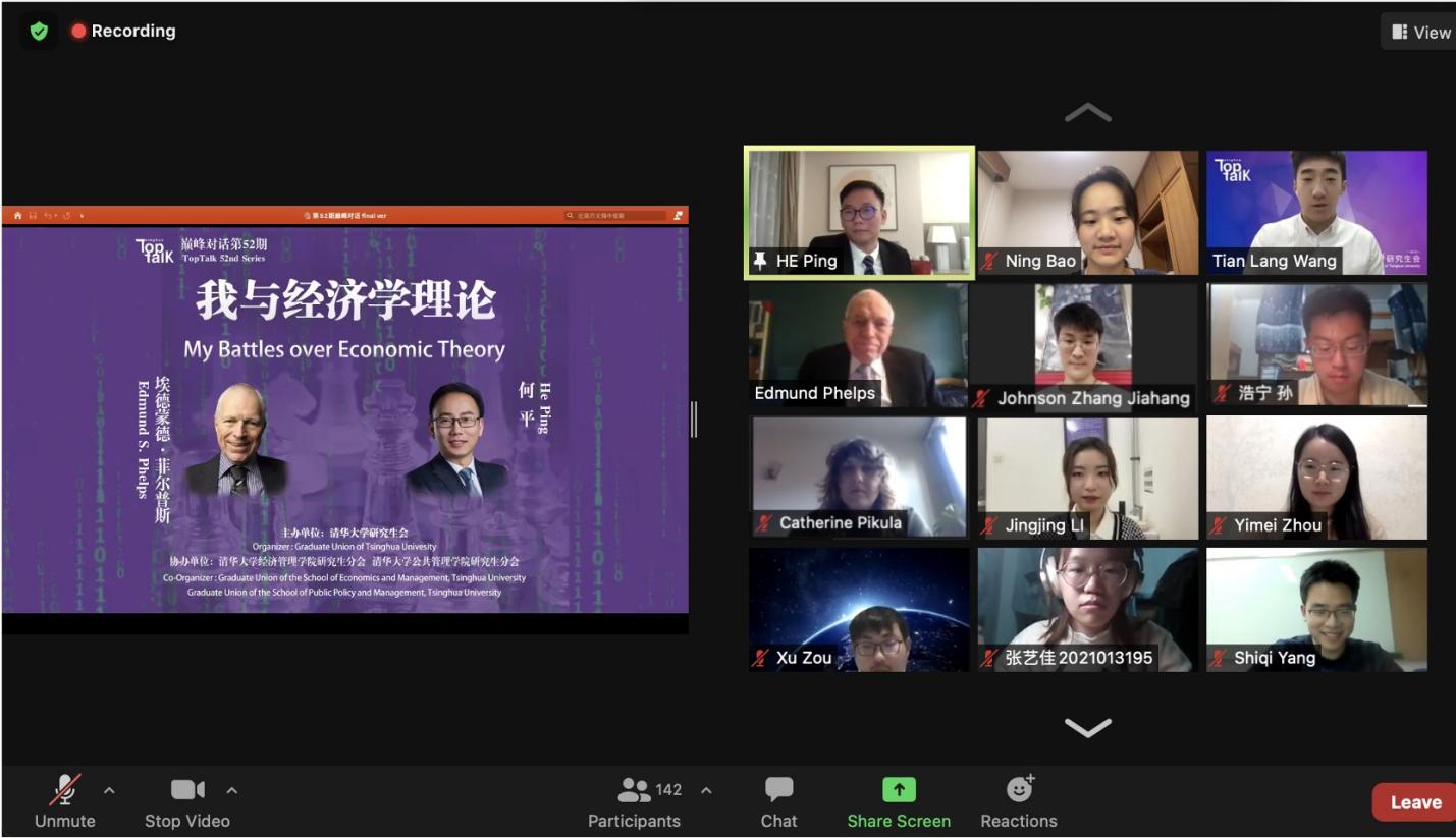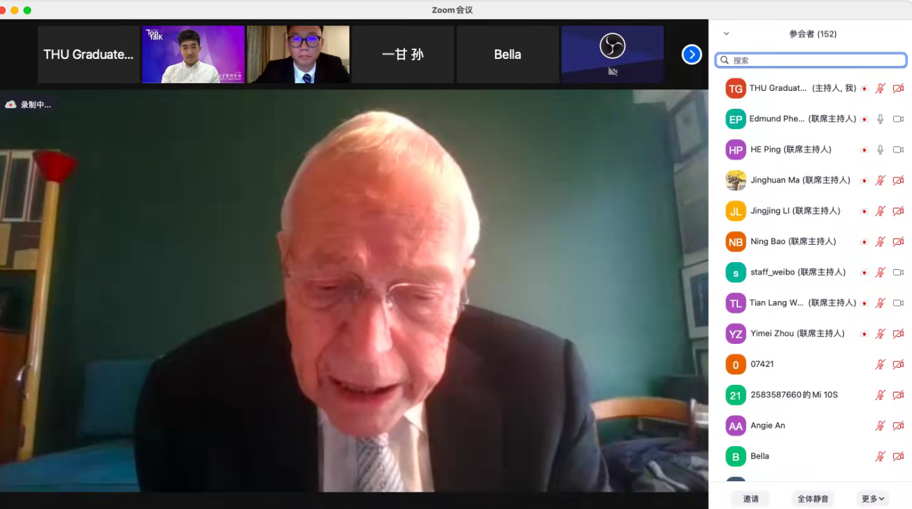 清华新闻网11月23日电 11月17日晚,诺贝尔经济学奖得主埃德蒙德•菲尔普斯(Edmund S. Phelps)做客第52期“巅峰对话”,讲述了他作为理论经济学家的职业生涯。经管学院何平教授担任对话嘉宾。本次活动由校研究生会主办,经管学院研究生分会、公管学院研究生分会协办,180余名师生线上参与本次活动,直播通道观看量达8138次。