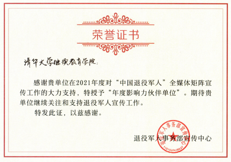 2021年在退役军人事务部宣传中心大力支持下,清华大学继续教育学院在八一建军节之际面向全国广大退役军人启动了清华终身学习云课堂荣光系列公益直播课,先后在建军节、全民国防教育日、空军节举办了三场大型公益直播,通过中国退役军人视频号、抖音号,中国军网、解放军报客户端,清华大学视频号,雨课堂等平台直播,累计180余万人与清华师生同上一堂国防教育课。同时,学院在清华终身学习小程序上正式推出退役军人课堂,重点面向广大退役士兵群体,以微课为主打造公益属性退役军人学习专区,持续无偿提供清华优质教育资源,构建人人皆学、处处能学、时时可学的终身学习生态圈。在乡村振兴领域,学院为退役军人事务部基层联系点之一的山东蒙阴县孟良崮沂蒙精神教育培训中心建设了清华大学乡村振兴蒙阴远程教学站,助力退役军人投身乡村振兴。2022年学院与退役军人事务部宣传中心将继续深入开展清华终身学习云课堂荣光系列、清华终身学习小程序退役军人课堂,持续为有需求的地区建设清华大学乡村振兴远程教学站,多措并举赋能退役军人就业创业,为新时代退役军人工作贡献清华力量。