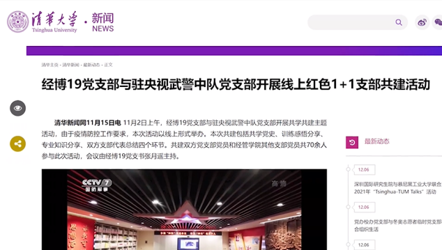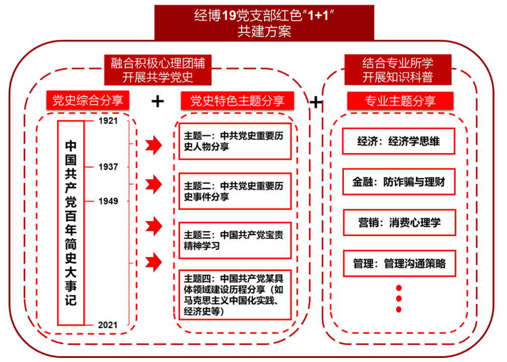经博19党支部与驻央视武警中队、建外街道开展党史共学活动,从党史中提炼出超越、勇气、智慧等积极心理要素,构建以党史学习为主、专业科普为辅的宣讲体系,形成包括百年党史串讲、长征精神、抗日民族统一战线的形成、管理沟通、金融防诈骗与理财知识、生活中的经济学等7大主题课程。通过线下共学、线上交流、实地观摩、参访交流等形式,先后与驻央视武警中队党支部、建外街道党建中心开展7次内容丰富的共建活动,发挥了朋辈激励的作用,为平安北京、创新北京的建设做出了贡献。红色“1+1”活动得到中央电视台、清华大学新闻网等媒体平台的宣传报道。