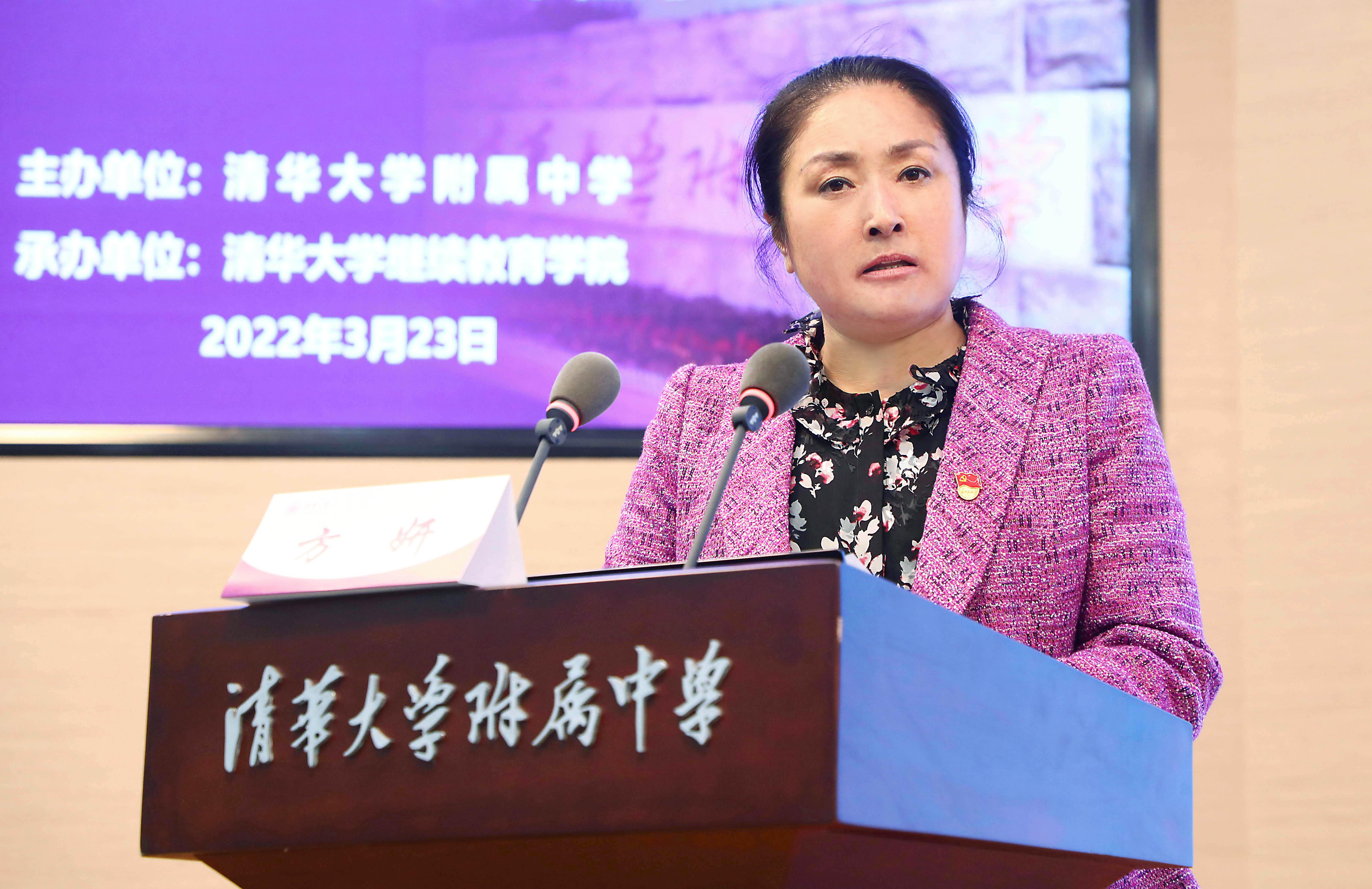清华附中党委书记方妍作开班动员发言。她表示,在当前国家大力推进基础教育高质量内涵式发展的新时代背景下,清华附中本部及各合作学校必须始终坚持用清华意识、清华标准来谋划和推动事业向前发展,对此附中专门联合清华大学继教学院定制设计为期近一年的培训课程。她要求全体干部学员通过“联系时代、思悟结合、切己体察”地学习,做“时代中人、性情中人、行动中人”,深入了解清华文化、全面提升管理技能,从而实现行动上的“齐步走”。