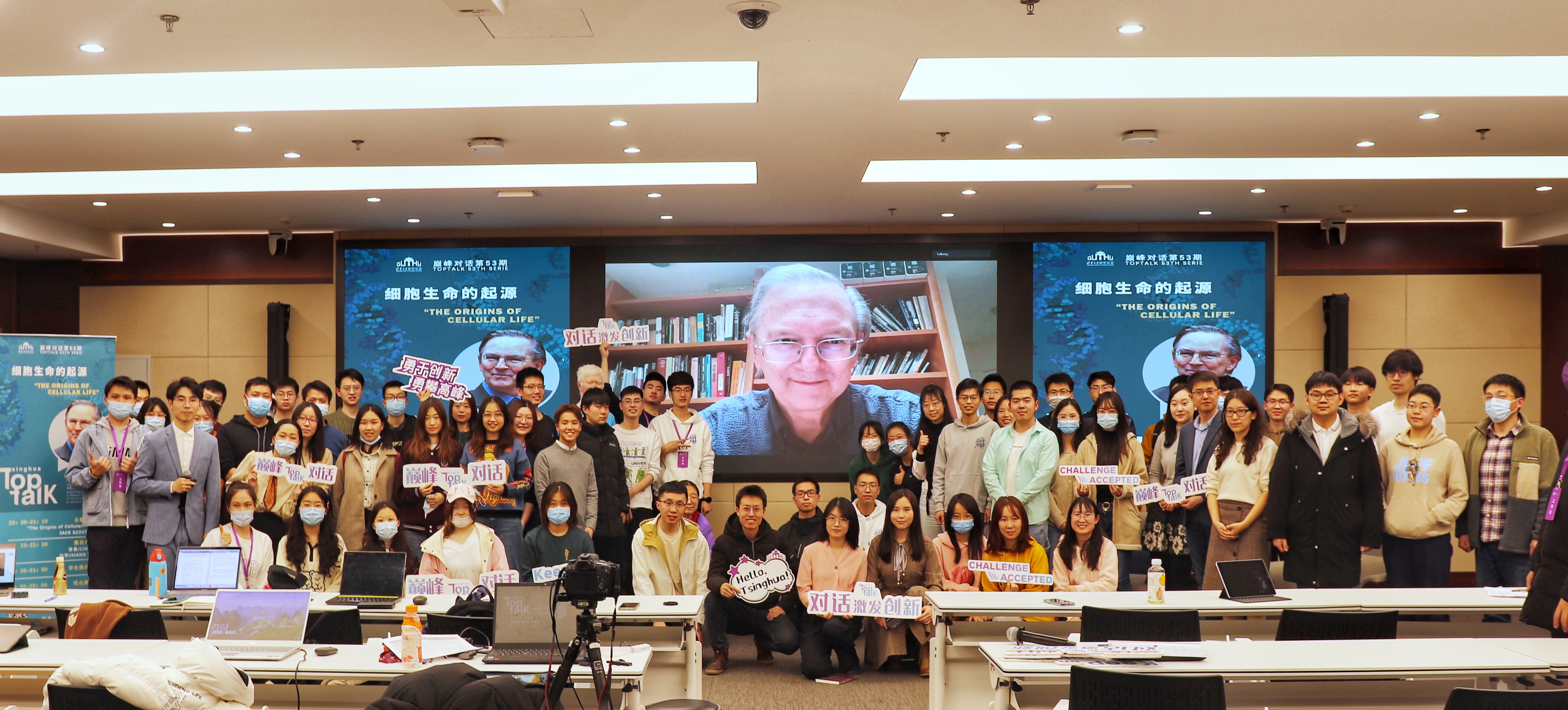 清华新闻网4月1日电(通讯员 孙琬琰 朱俊)3月24日晚,以“细胞生命的起源”为主题的第53期“巅峰对话(Top Talk)”在清华大学生物医学馆举办。2009年诺贝尔生理学或医学奖获得者杰克·绍斯塔克(Jack Szostak)担任活动特邀嘉宾,清华大学生命科学学院助理、研究员吝易与化学系副教授向宇共同担任对话嘉宾,与清华学子开展了一场关于细胞生命起源的对话。
