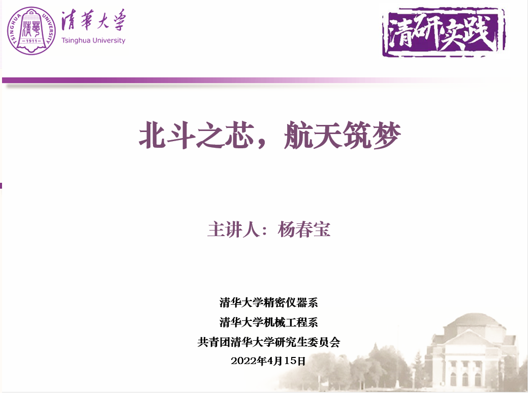 清华新闻网4月23日电 4月15日,广州海格通信集团北斗导航首席科学家、清华大学精仪系1994级校友杨春宝以“北斗系统与北斗精神”为题,通过线上形式深入浅出地分享了自己对北斗事业的理解与思考。活动吸引来自20多个院系的近200名同学参与。