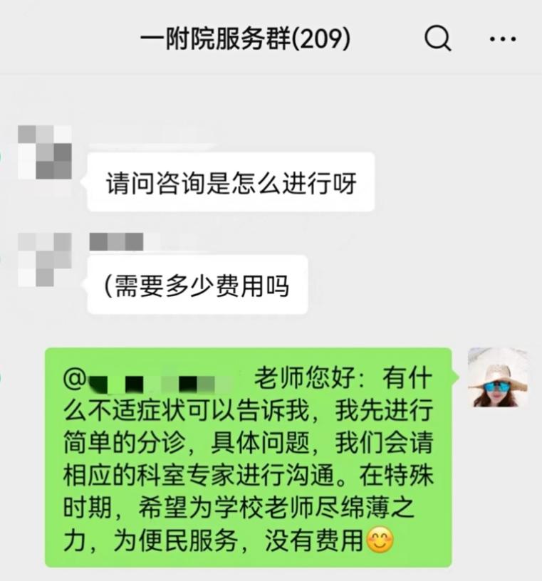 5月18日,名为“一附院服务群”的微信群正式建立。有需要的师生可以入群,并在群内直接提问,由医生远程提供健康咨询及就医指导。如病情涉及隐私,医生则会与患者微信单独沟通,了解病情,提出建议。