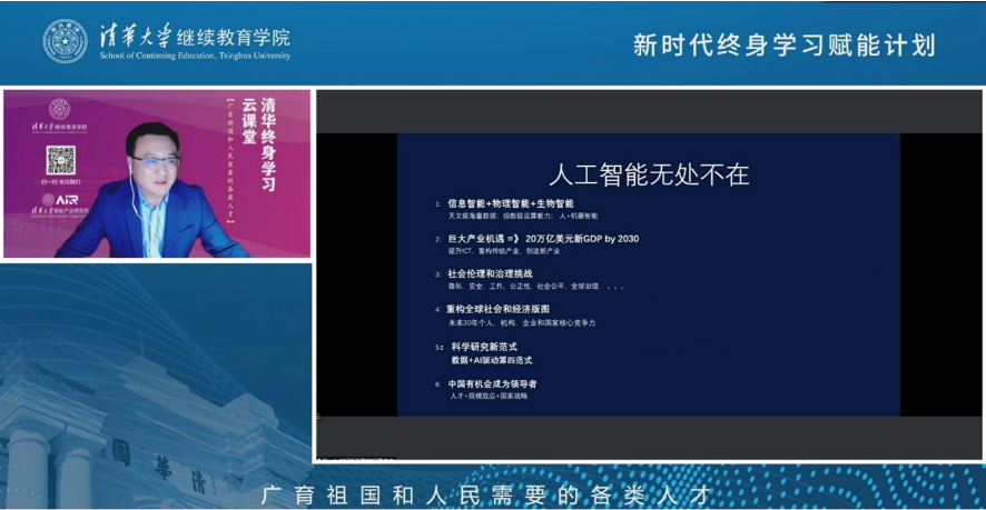 清华新闻网9月5日电 9月4日上午,清华大学继续教育学院“院士讲坛”第三讲在清华终身学习平台开讲。中国工程院院士、清华大学讲席教授、清华大学智能产业研究院(AIR)院长张亚勤主讲“人工智能无处不在”。来自全国各地各行业领域的上千名终身学习者参加了在线学习。