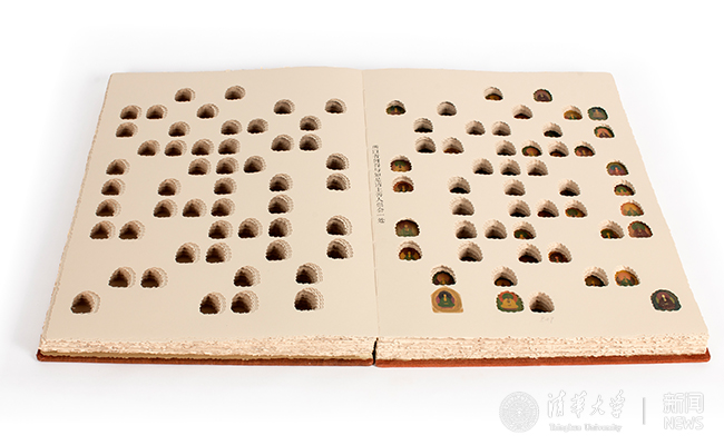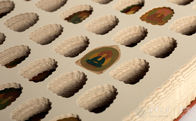 徐小鼎和董雪凌合作设计的作品《阿弥陀经》是一本全手工制作的艺术家手制书,其灵感来源于中国书籍装帧艺术和传统佛教石窟中的造像与壁画。作品运用手工装帧、雕刻和绘画相结合的方式,力图在书籍并不大的方寸空间内展现出具有历史感和叙事性的宏大场面,并将文本和图像在书籍作品特有的翻阅过程中进行有效的融合。作品的封面材质采用手工染色的麻布,内页选择专用版画纸,佛像运用天然矿物质颜料进行绘制并用中国传统的锁线装进行装帧。