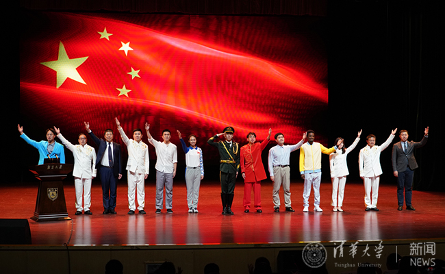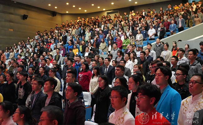 宣讲会上还播放了《清华大学庆祝中华人民共和国成立70周年》的视频, 当大荧幕上呈现 “天安门广场上,五星红旗迎风飘扬,全场齐声高唱中华人民共和国国歌” “祖国万岁!清华加油!”的画面时,热烈的欢呼声响彻整个会场。