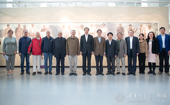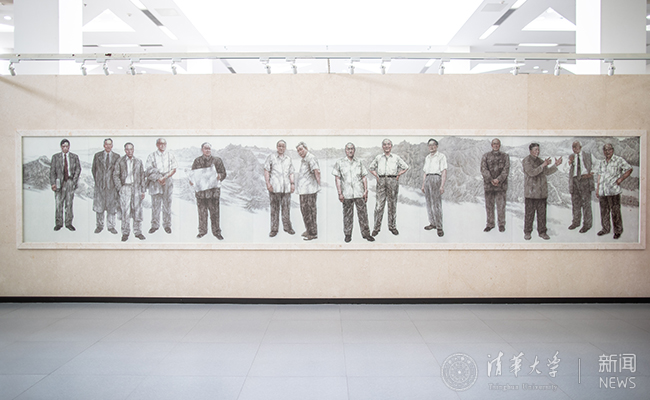 走进清华大学校史馆二层主展厅,映入眼帘的便是巨幅长卷《以身许国图》。这幅作品以“两弹一星”元勋中的14位清华人为素材,以万里长城和祖国河山为背景,生动刻画了科学家们“以身许国壮河山”的豪情风貌。作品中的人物从左至右依次为:郭永怀、赵九章、陈芳允、王淦昌、钱三强、王大珩、彭桓武、杨嘉墀、王希季、周光召、钱学森、邓稼先、朱光亚、屠守锷。这幅作品创作于清华大学90年校庆之际,在清华大学校史馆长期展出。