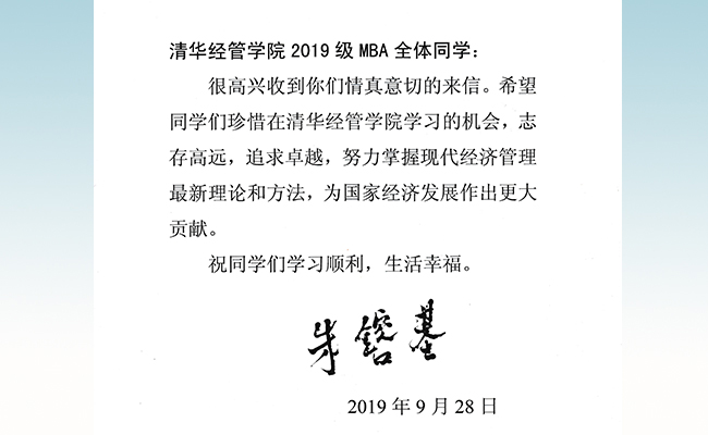 清华新闻网10月2日电 2019年9月28日,在即将迎来新中国成立70周年之际,清华大学经管学院2019级MBA全体新生收到一份意外而珍贵的礼物——首任院长朱镕基学长给2019级MBA全体新生的回信。全文如下: