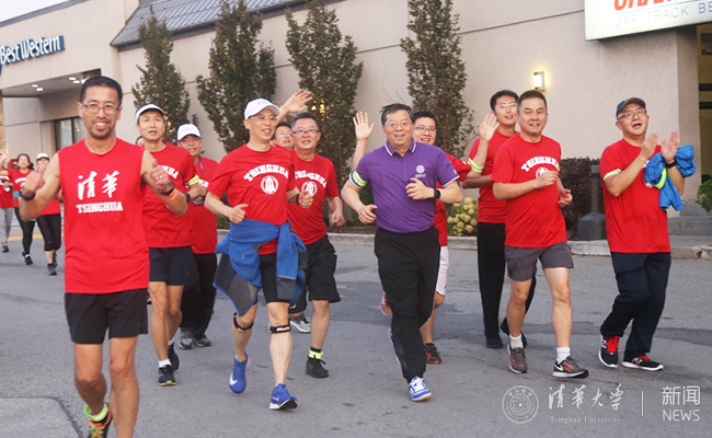 21日早晨,邱勇与200余校友一起晨跑3000米
