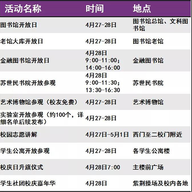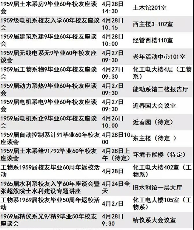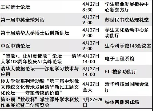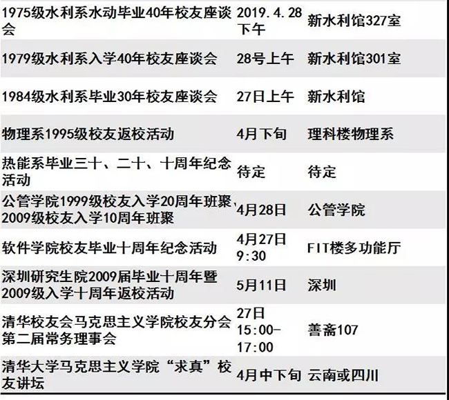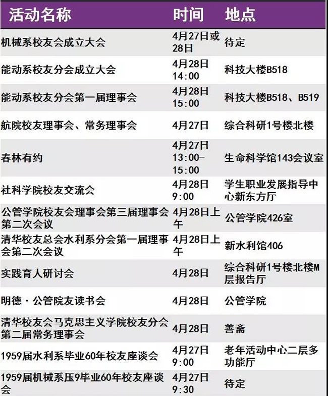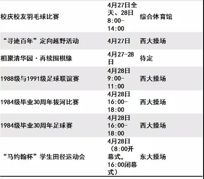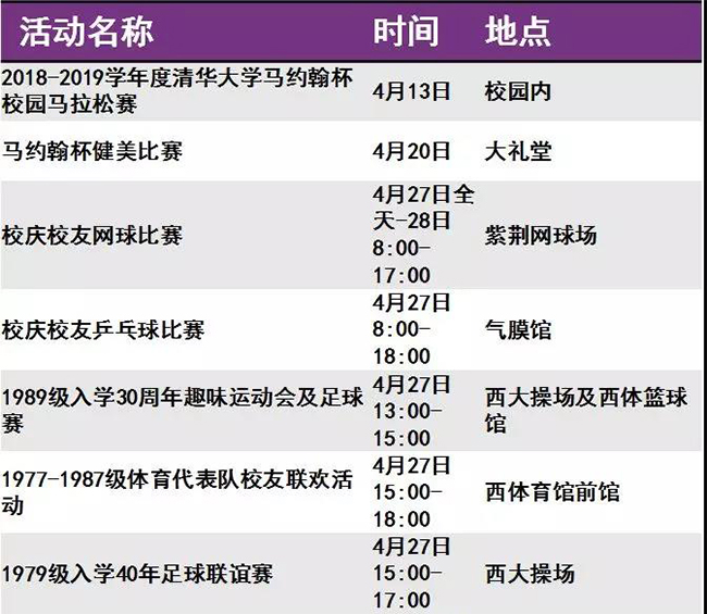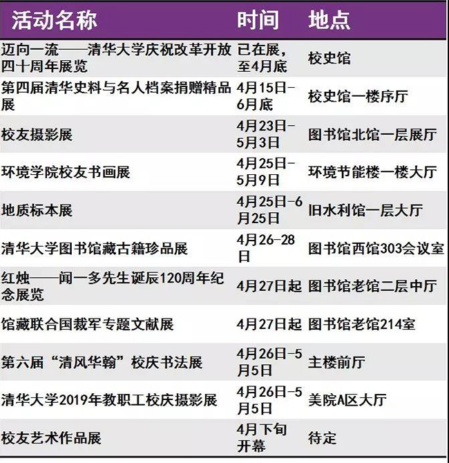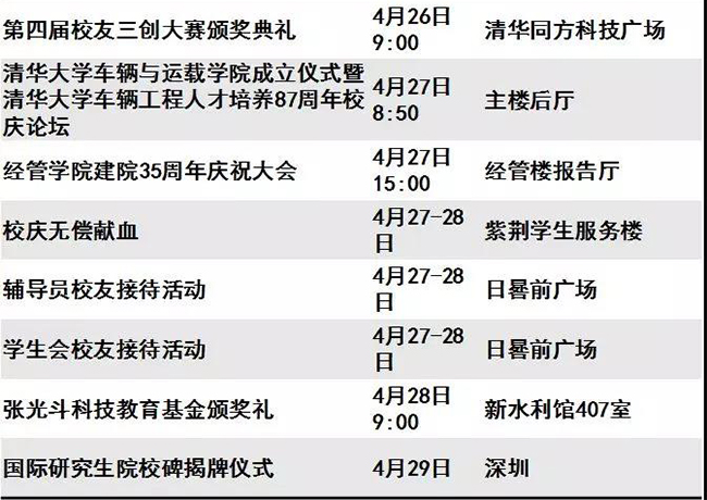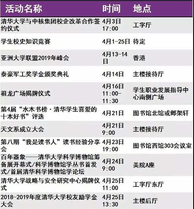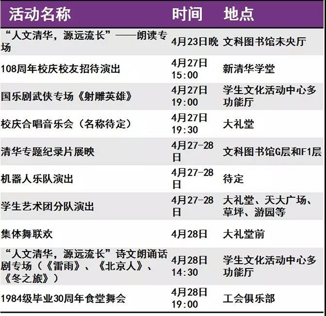 迎来“本命年”的清华呈现出一派生机勃勃的景象。等你回家的不仅是亲切的师长同窗、满园春意与点滴回忆,还有丰富多彩的校庆活动。秩年、综合、学术、体育、展览、开放、文艺、院系活动,8类活动先后呈现。
