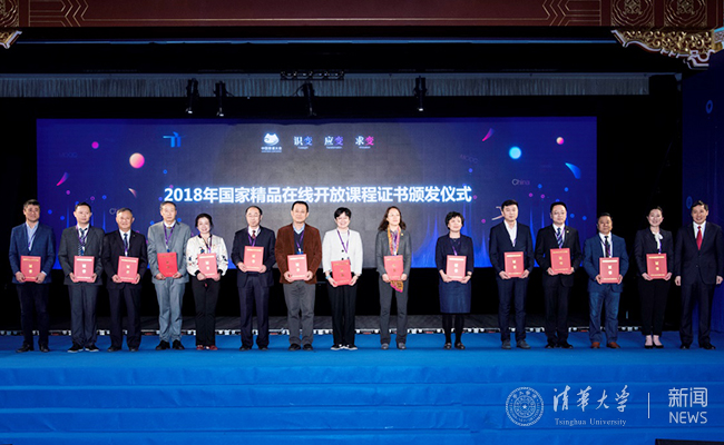 会上,钟登华为第二批国家精品在线开放课程认定结果和国家虚拟仿真实验教学项目负责人代表颁发证书,鼓励更多教师参与到中国慕课建设应用中来。清华大学共有40门课程获得2018年国家精品在线开放课程认定,3项教学项目获得国家虚拟仿真实验教学项目认定。清华大学教师邓俊辉、李双寿作为国家精品在线开放课程和国家虚拟仿真实验教学项目负责人代表出席大会并领取证书。