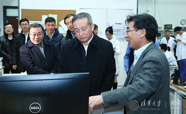 张家明一行首先来到物理系量子科学与技术实验室,看望了工作在科研一线的10余名教师和研究生。薛其坤介绍了实验室在量子反常霍尔效应实验发现等研究中取得的成果,以及假期中实验室研究生的工作情况。张家明对同学们在假期坚持学习、科研的精神表示赞赏,鼓励同学们在导师的带领下,刻苦钻研,快速成长为科技领域的排头兵,为我国科研事业作出更大贡献。