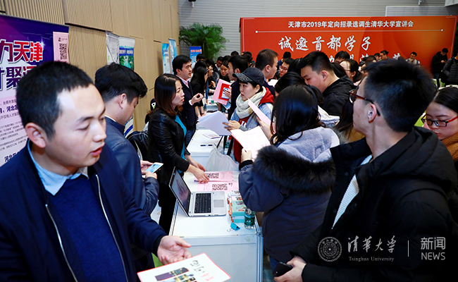 清华大学在津校友代表、天津市华明高新区管委会主任林成涛,天津市城市管理委员会干部陈丰分别介绍了在津工作的经历和感想。天津市委组织部人才工作处负责同志介绍了定向招录选调生工作的有关安排。各选调单位相关负责同志接受了同学们的现场咨询。