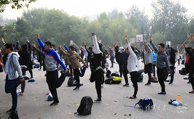 10月14日上午8时,首批报名参加游泳测试的本科新生陆续来到游泳馆附近列队集合,在老师的带领下做准备活动并入场。相比“第一堂体育课”后的踊跃报名,同学们的热情丝毫不减,全程认真跟老师做准备活动。