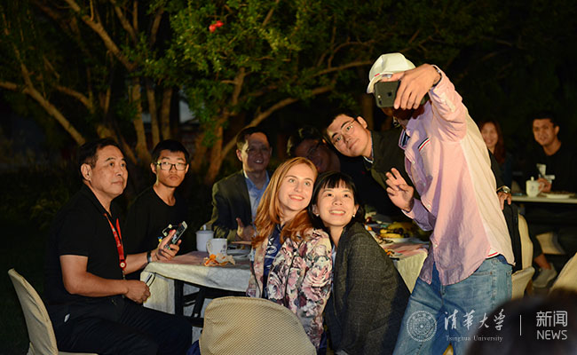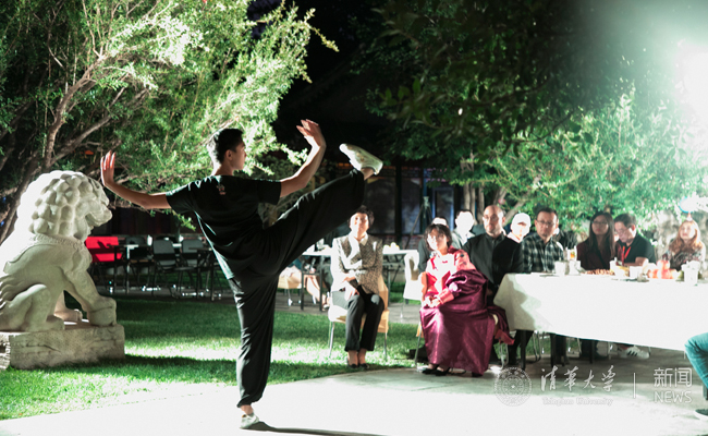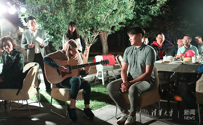 新闻学院李嘉贝同学与生命学院刘建康同学以《两个月亮》的诗歌朗诵寄寓了浓浓的思乡之情。工物系邹继浩同学现场表演了一段轻灵圆活、松柔慢匀的太极拳,在皓月的映衬下颇有意境。来自美国的美术学院马腾飞同学与来自白俄罗斯的人文与社科类苏小小同学通过对话的方式分享了他们初入清华的经历与感受,新奇与欣喜之情跃然而出。能动系阿尔曼·巴哈提别克同学的一首《你的目光》与新闻学院次仁拉姆同学的一首《乡恋》让人陶醉于清澈悠扬的歌声中。陈旭饶有兴趣地与新生班主任、材料学院潘伟教授合唱了《敖包相会》,将茶话会推向了高潮。