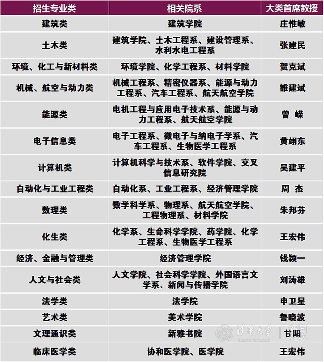 为了落实清华大学以通识教育为基础,通识教育与专业教育相融合的本科教育体系,2017年,清华大学全面推行大类招生培养和管理,将纳入本科招生的所有专业整合为16大类,学生填报志愿的时候将需要按照专业类来填报。在大一年级,所有学生将接受大类统一的通识教育课程、专业导引课程、专业基础课程等,在大一结束前完成专业确认,并在大二进入相关院系开始专业学习。