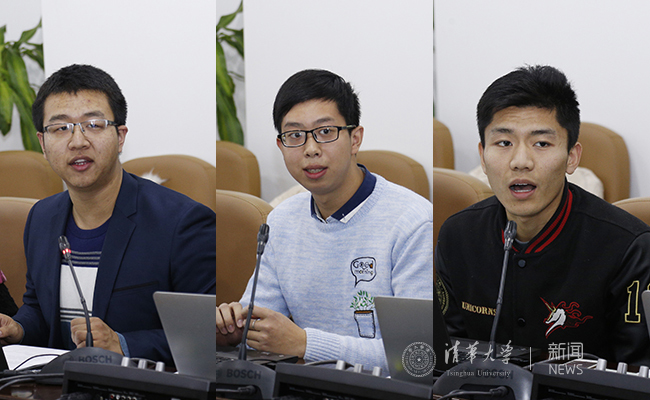 赵文轩、韩沛达、李晨宁作提案汇报。记者 张宇 摄