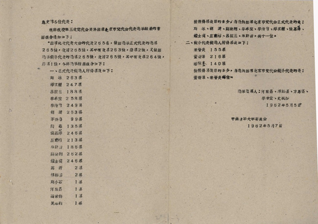 1962年5月5日,清华大学召开第三次党代会,选举中共北京市第三届代表大会的代表。根据北京市委分配的名额,大会选出清华大学出席第三届市党代会的正式代表11人、候补代表2人。刘冰得票263票,票数最高。