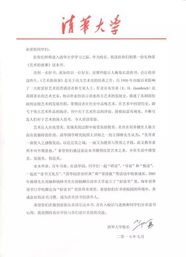 清华大学寄出2017年首封录取通知书 校长赠书《艺术的故事》