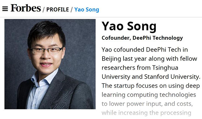 入选“企业技术(Enterprise Technology)”类别的姚颂2011年本科入学就读于清华电子工程系,在校期间曾任清华大学电子系科协主席。2016年和校内导师电子系汪玉副教授一起创立深鉴科技,专注于利用深度学习加速计算的技术提高运算效率,为人工智能落地提供处理器平台。深鉴科技于2016年获得种子基金的支持,同时也是清华x-lab的注册在培团队。创业初期,这支主要由电子系的毕业生组成的团队得到了学校提供的创新创业教育资源的大力帮助,例如:在“创办新企业”课程中学习创业入门本领,在清华大学交叉创新中心—XIN中心聆听以色列商业导师和律师讲解从技术思维到商品思维的转换,在x-lab获取各种创业资源与信息,和启迪之星、启迪创投等机构深度交流,并经“创+”推荐至同方孵化器提供注册地点与办公地点。