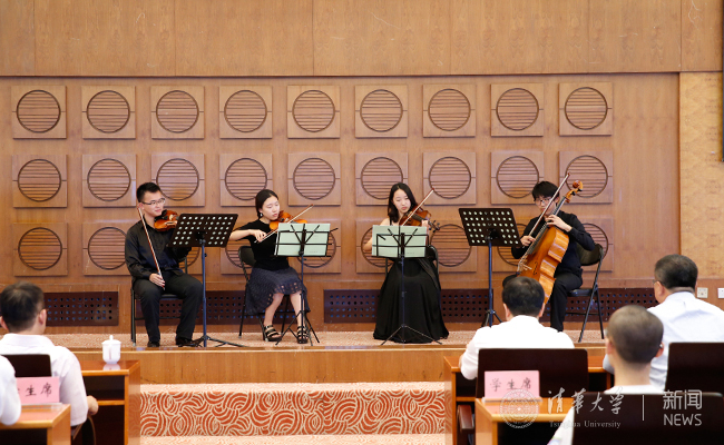 典礼现场的弦乐四重奏。记者 张 宇 摄