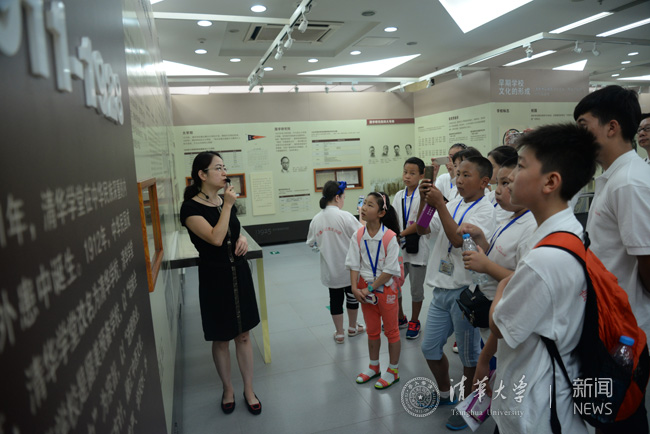在清华大学党委宣传部和校团委师生的安排和组织下,小记者团先到校史馆学习了清华校史,又到第一教学楼在清华学生科技创新团队工作室进行了交流,并在学生志愿者的带领下,参观了二校门、大礼堂、水木清华等地。