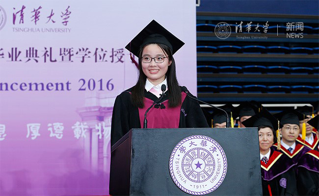 毕业生代表、法学院2012级本科生蔡泽洲讲述了自己在清华园中四年的成长故事。她说,四年来我们在清华的每个角落留下了自己的气息;清华也真真切切在我们身上打下了深深的烙印。这些烙印来源于园子里的老师、同学展现出的追求卓越的清华精神,亦来源于园子内外的每一段学习实践经历,这些经历让我们多了一份“家事国事天下事事事关心”的家国情怀。四年前,清华是我们的不二选择;未来,服务于国家发展、为民族乃至人类的进步贡献力量应始终是我们不二的选择。
