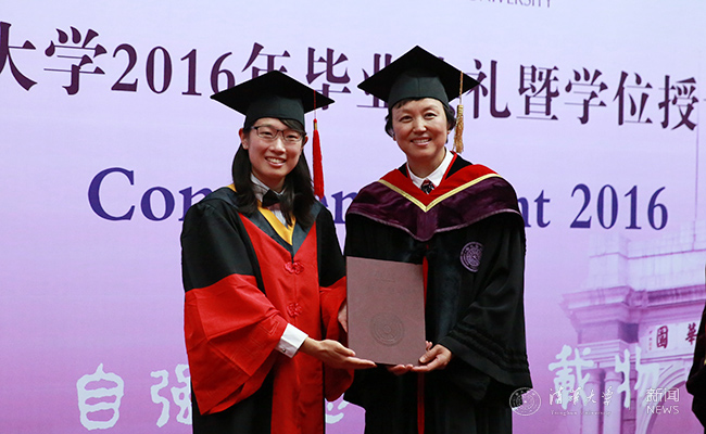 环境学院2013级博士生陈熹作为毕业生代表发言。她向辛勤培养自己的母校、师长和亲友们表达了由衷谢意,并回忆了在清华的学习和生活经历。她曾经连站军姿都晕倒,在校期间刻苦锻炼,拿到73个马杯单项冠军,连续十年夺得女子三项全能金牌。全场不时爆发热烈的掌声。陈熹说,清华热情的体育传统感染了她,“为祖国健康工作五十年”的清华体育精神勉励她勤奋坚持方能造就不凡,追求卓越才能超越自我。未来无论从事怎样的工作,作为清华人,都应该把个人价值融入到国家发展和人类进步的宏伟事业中。今天是一个新起点,未来人生路将继续迎风远航。