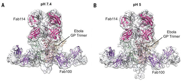 后续的实验发现这两种抗体的作用靶点都位于埃博拉病毒表面糖蛋白GP。为了阐明这两种抗体的工作机制,需要从结构生物学的角度研究两种抗体与埃博拉病毒表面GP蛋白的结合方式和作用机理。利用清华大学冷冻电子显微镜平台的技术优势,向烨实验室完成了GP蛋白与两种抗体抗原结合片段(Fab)复合物在两种不同pH下的冷冻电镜结构研究,结合合作者的晶体学、生物化学的实验结果,揭示了埃博拉GP蛋白与两种抗体Fab片段复合物的精细结构,并依此解释了这两种高效抗体的作用机制。