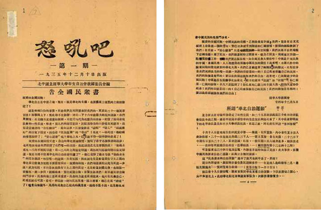 “一二·九”运动的第二天,《告全国民众书》就由油印变成了铅印,出现在清华大学的校刊上。“校刊的名字叫《清华周刊》,只有12月10号的那一期改名叫《怒吼吧》。”