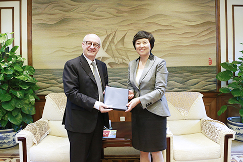 陈旭与迪枚晔教授互赠纪念品。记者 张宇 摄
