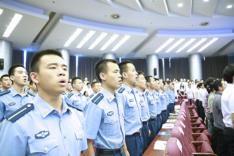 校长邱勇向毕业的国防定向生和飞行学员授予了印有“携笔从戎,投身国防”、“兴核强国、服务社会”和“壮志凌云,追求卓越”口号的旗帜。授旗后,全体毕业生举起右拳,庄严宣誓,响亮的誓言响彻整个大厅,感染了在场的每一个人。
