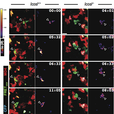 图为通过双光子显微镜实时观察到的生发中心内T细胞(绿色)与B细胞(红色)纠缠互作时产生钙信号(热度图)的情况(左:野生型B细胞;右:ICOSL缺陷的B细胞)。