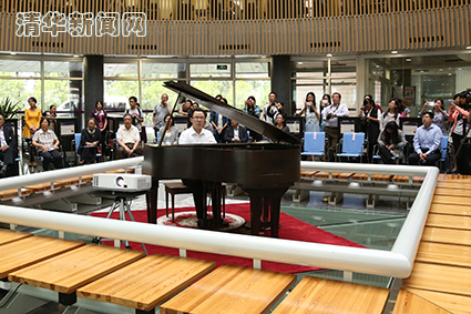 图为赵小中,赵元任先生次女赵新那之子黄家汉、黄家林,清华大学原党委书记贺美英,副校长谢维和,图书馆馆长邓景康等六人共同为钢琴揭幕。