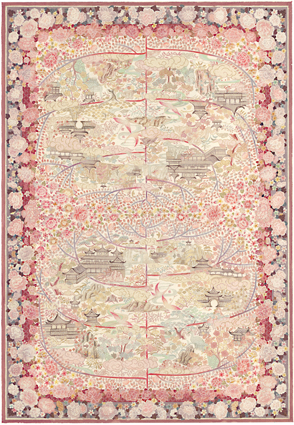 《红楼·枉凝眉》设计灵感来源于电视剧《红楼梦》主题曲《枉凝眉》,作品紧扣大赛“美·缘”主题,达到形式与内容的统一。评委认为其情景构思奇妙、透射主题,运用花卉、建筑、山石、树木和飞鸟等元素,借鉴了传统山水工笔和写意画的装饰效果;构图饱满,主次、疏密恰当;色调温暖,画面柔雅、清秀、灵动;层次丰富,技法娴熟,将传统经典进行了时尚演绎,体现一种具象与抽象、现实与虚幻的意境之美。