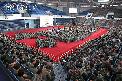 清华新闻网9月12日电(学生记者 宋 亮 记者 王 蕾)“西山苍苍,东海茫茫,吾校庄严,四个操场……”9月11日下午,随着大屏幕播出的一段生动风趣的动画视频,清华大学2014级新生第一堂体育课拉开序幕。数千名身穿迷彩服的大一新生齐聚清华综合体育馆,与学校全体体育教师面对面,聆听几代清华人的体育故事,全面了解清华体育要求,领略清华体育精神。