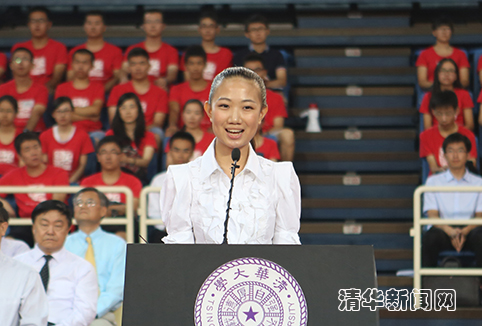 经管学院彭玥晗作为新生代表在典礼上发言,她说,成为清华园的新主人,重要的是摘下头顶的光环,谦逊的在园子里学习;是梦想不灭,奋斗不止;是责任在肩,义不容辞。用四载光阴换一个对青春无悔的承诺,以踏实笃行,让梦想在清华高飞。