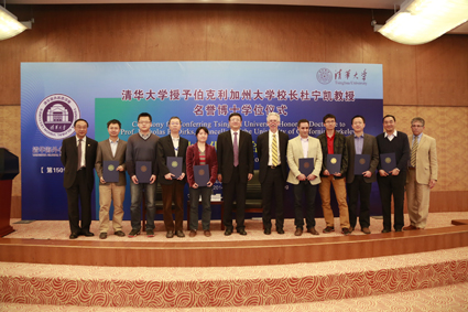 图为“清华大学-伯克利联合科研基金”获得资助教师与两位校长合影。学生记者 王皓冉 摄
