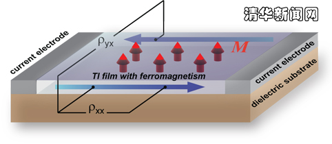 量子反常霍尔效应的测量器件示意图:将分子束外延生长的铁磁拓扑绝缘体薄膜制备成场效应晶体管的结构,并对其霍尔电阻ryx 和纵向电阻rxx进行精密测量。