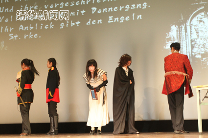 此后是即兴说理环节,各代表队根据现场抽到的题目进行了精彩的演讲。即兴说理过后,全场迎来了本次比赛的高潮——人文演绎环节。人文演绎是以自编剧本为基础的短剧演绎,因其观赏性和趣味性受到观众喜爱。在此环节,除了清华大学代表队,各支代表队均撷取了中国历史的某一片段作为时间背景,其中,有两支队伍以王安石变法为背景。而清华大学代表队别出心裁,以《浮士德》为主题,由歌德和魔鬼展开了对“启蒙”的思考。各支队伍经过精心准备,将个人思考注入到历史故事中重新演绎,为观众们创造了一场精彩纷呈的视觉盛宴。