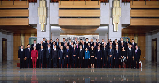会见后,朱镕基、王岐山、刘延东、马凯等与参加清华大学经济管理学院顾问委员会2013年会议的顾问委员们合影留念。