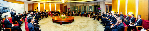 清华新闻网10月30日电 10月23日下午,清华大学经济管理学院首任院长、学院顾问委员会名誉主席朱镕基及夫人劳安,中共中央政治局常委、中央纪委书记、清华经管学院顾问委员会名誉委员王岐山,中共中央政治局委员、国务院副总理刘延东,中共中央政治局委员、国务院副总理、学院顾问委员会委员马凯在钓鱼台国宾馆亲切会见了参加清华大学经济管理学院顾问委员会2013年会议的顾问委员。