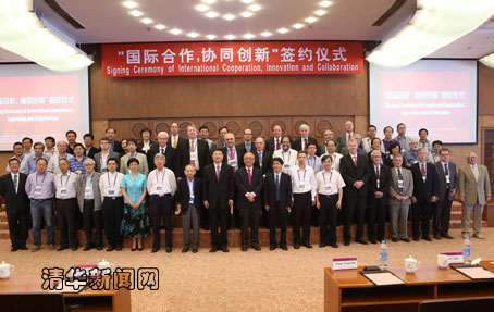 清华新闻网5月30日电 (记者 李含)5月29日,“国际合作,协同创新”研讨会在清华大学举行。来自哈佛大学、剑桥大学等世界著名高校和研究院的国际顶尖数学家共聚清华,就数学学科发展、平台建设、科研合作及人才培养等问题进行深入交流与研讨。会议期间,清华大学数学科学中心与中科院、哈佛大学、剑桥大学等30余所世界著名大学相关院系、研究院分别签署了双边合作备忘录,共同搭建数学科学国际交流平台。教育部国际合作与交流司副司长陈盈晖,清华大学校长陈吉宁,校务委员会副主任陈旭,副校长薛其坤,哈佛大学教授、菲尔兹奖得主、清华大学数学科学中心主任丘成桐教授出席当天下午在清华大学主楼举行的签约仪式。